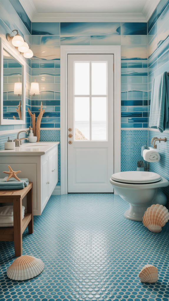 14. Ocean-Inspired Blue Penny Tile Floors