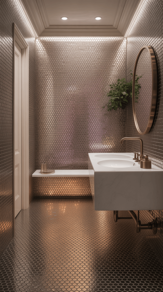Want to add a touch of glamour without going full-on disco ball? Metallic penny tiles are your answer.