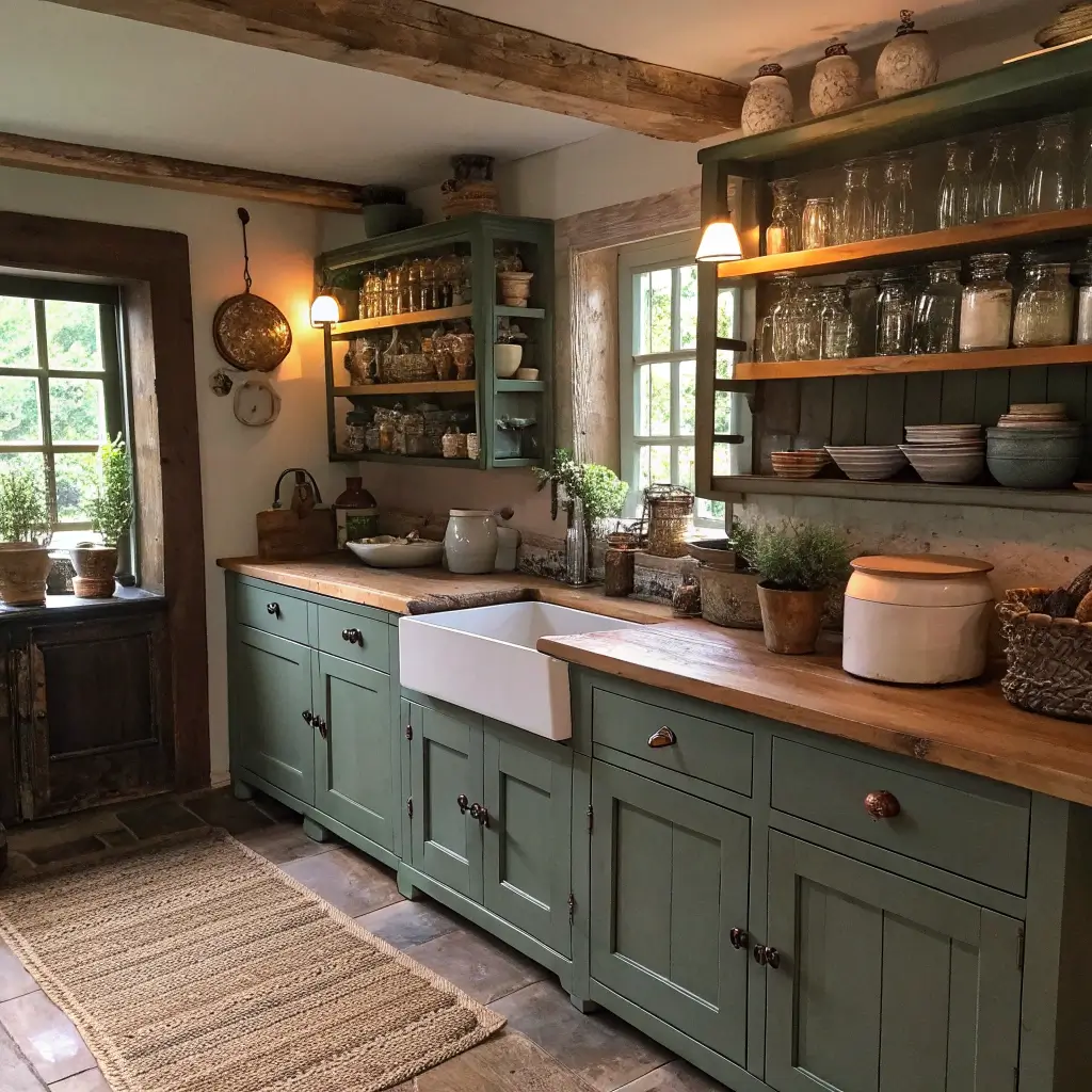 Rustic Farmhouse Kitchen with Pewter Green Cabinets