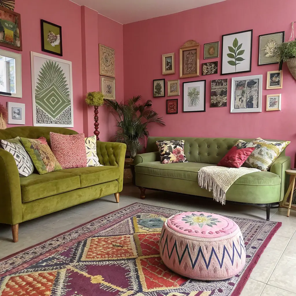 Oh, the boho vibes are strong with this one! Dusty rose and forest green create that perfect earthy-meets-romantic atmosphere that bohemian style is all about. This combination feels grounded yet dreamy, perfect for creating a living room that doubles as your personal sanctuary.