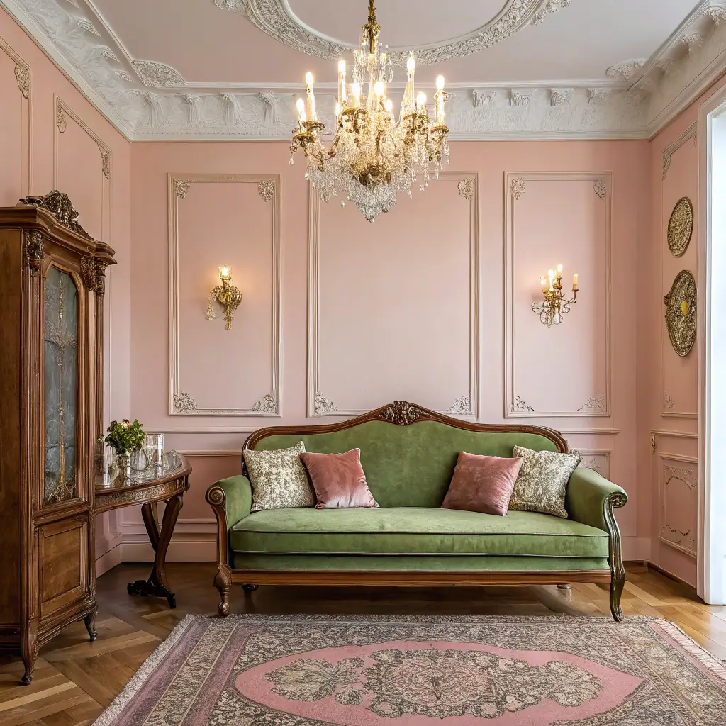 The vintage approach loves curves and character. Hunt for that perfect moss green velvet armchair with curved wooden arms. Pair it with a light pink tufted ottoman. Add vintage brass lamps with pink lampshades, and suddenly you’ve created a space that feels both nostalgic and fresh.