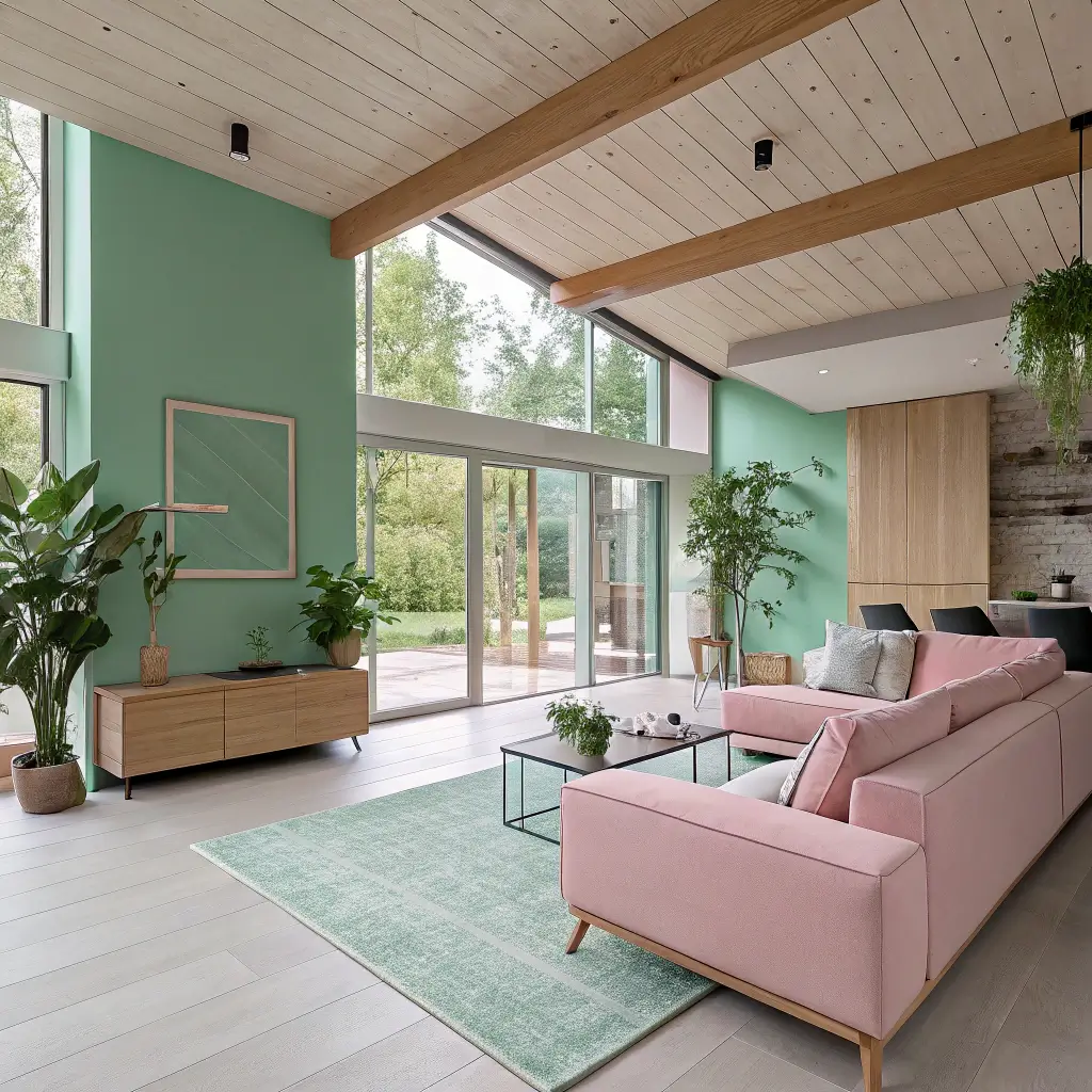 Open concept spaces can be tricky—how do you create flow while defining different areas? Pink and mint green create natural zones without building walls. Use color to guide the eye and create distinct spaces within your open floor plan.