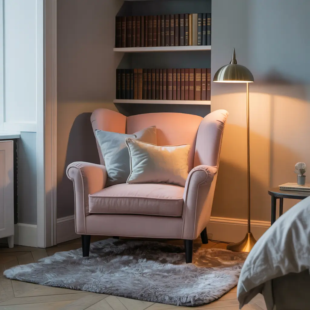 You don’t need a massive bedroom to make this work. I carved out a reading nook in my 10×12 bedroom using just one corner. Position a comfy grey armchair at an angle, add a soft pink ottoman, and boom – instant reading paradise.