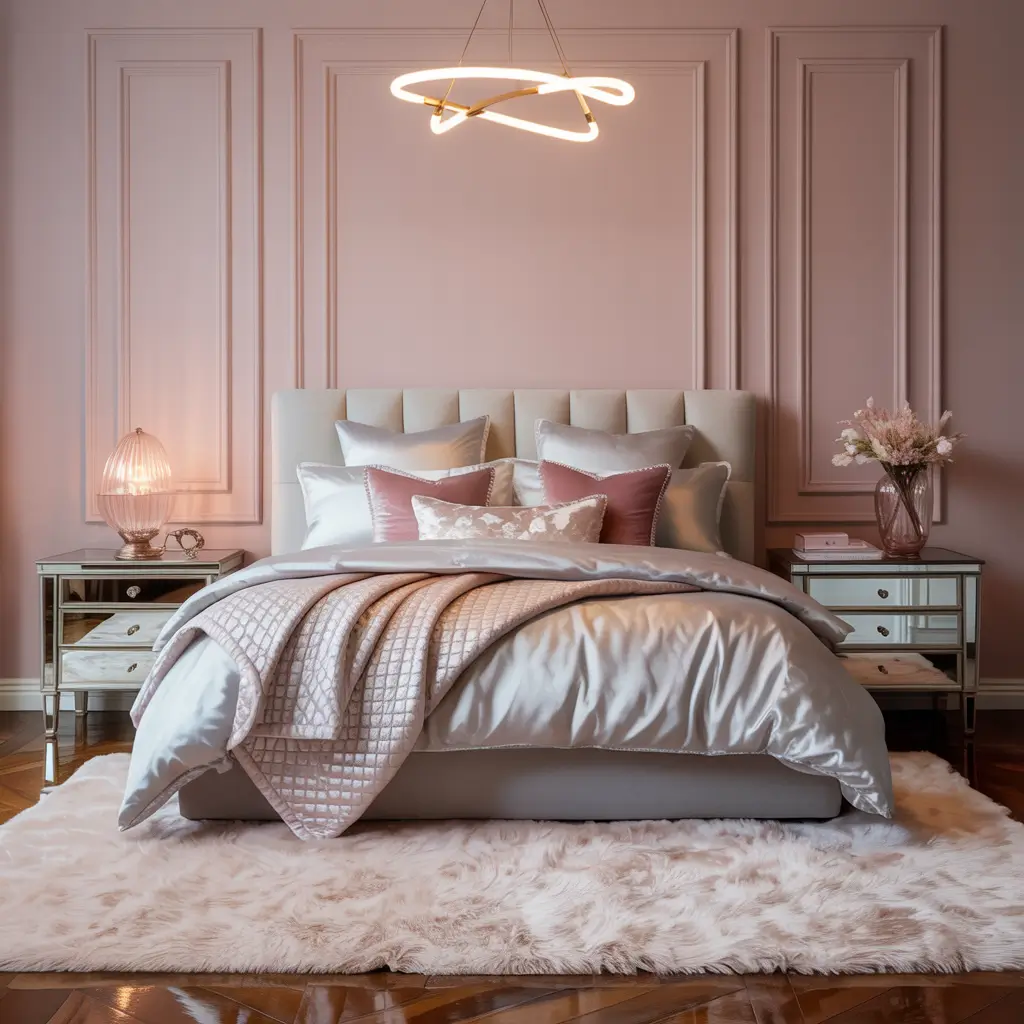 Start with silver grey silk or satin bedding as your base. I’m talking high thread count sheets that make you feel like royalty. Layer in pastel pink through plush pillows and maybe a cashmere throw (or a really good fake – we’re not all millionaires).