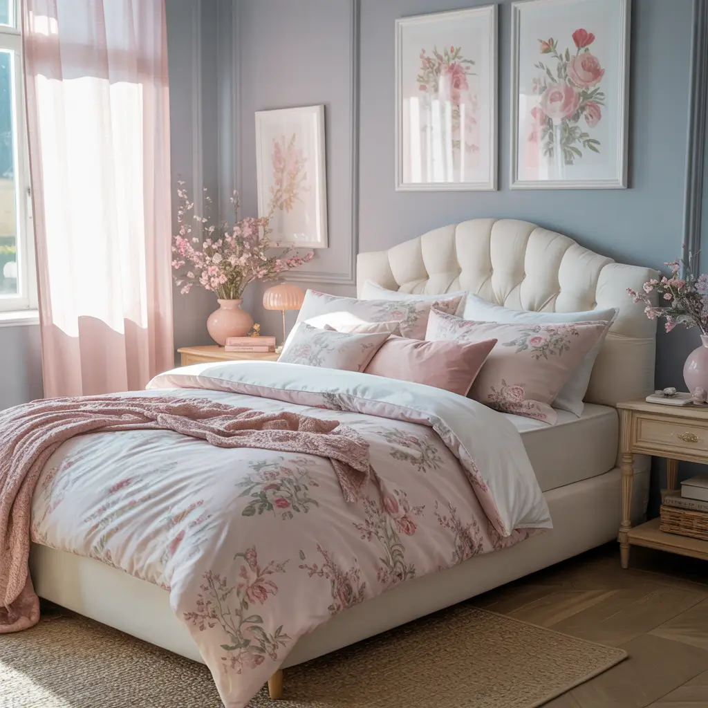 Not ready to commit to pink walls? Grey walls with pink floral accents offer the perfect compromise. This approach lets you embrace femininity without going full-on princess bedroom.