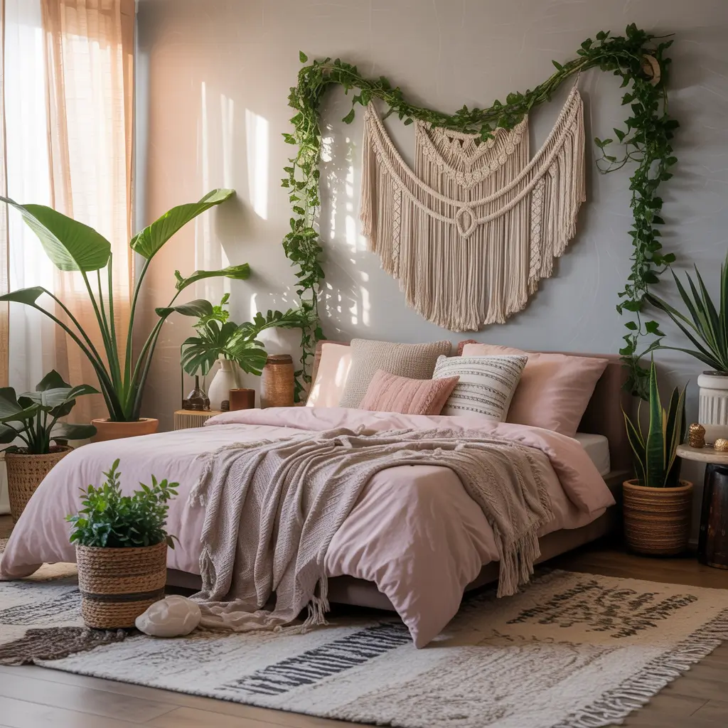 Layer, layer, layer! Start with grey walls or a grey upholstered headboard, then go wild with pink textiles. Mix different shades of pink – blush, rose, mauve – they all play nicely together in boho style.