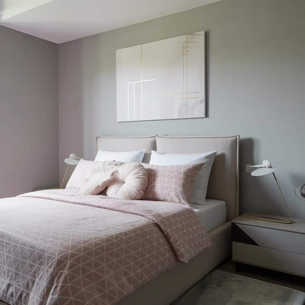 Geometric patterns keep pink from feeling too sweet and grey from feeling too serious. This modern approach works especially well in smaller bedrooms where you want visual interest without overwhelming the space.