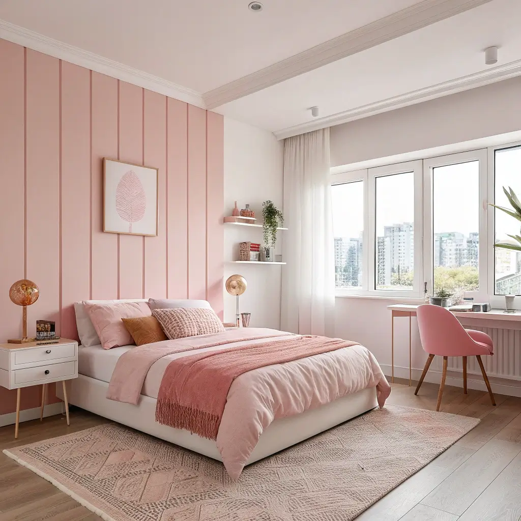 Stick to clean lines and simple furniture. A platform bed with crisp white sheets, one coral throw pillow, and maybe a single piece of abstract art in pink tones. The beauty lies in the intentional emptiness – every item you choose needs to earn its place in the room.