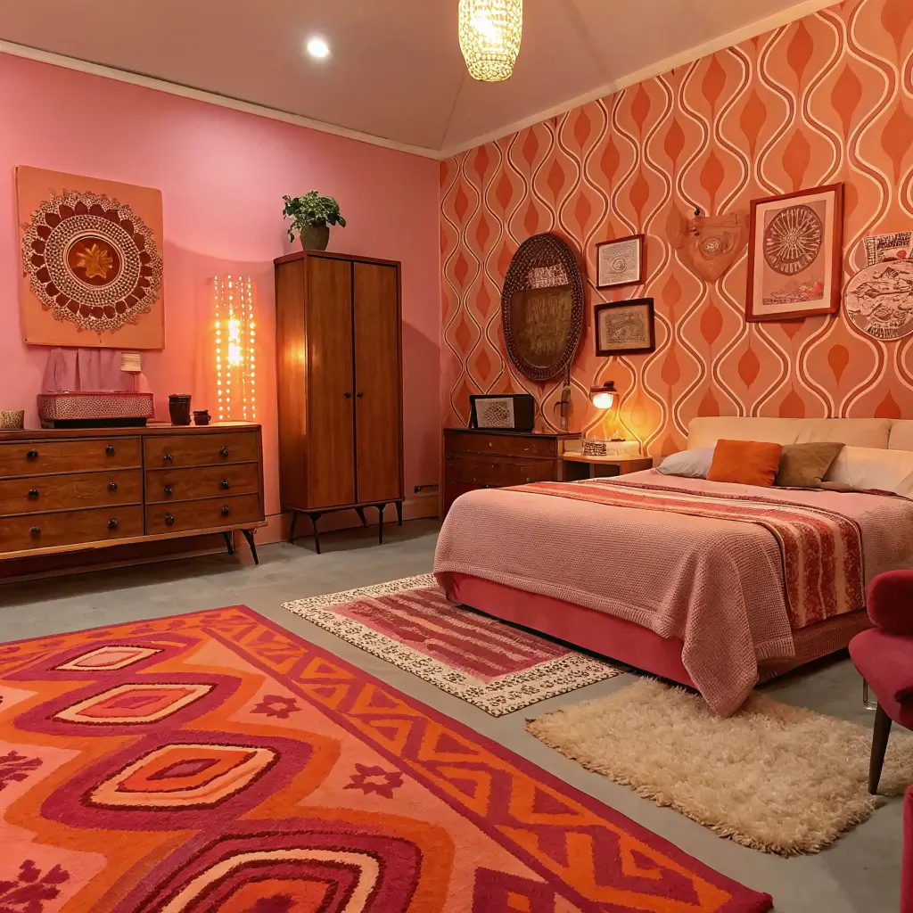 Think psychedelic patterns, shag rugs, and curved furniture. I scored a vintage orange velvet headboard at a thrift store that became the centerpiece of my retro bedroom makeover. Pair it with pink geometric wallpaper and you’re basically living in a time machine.