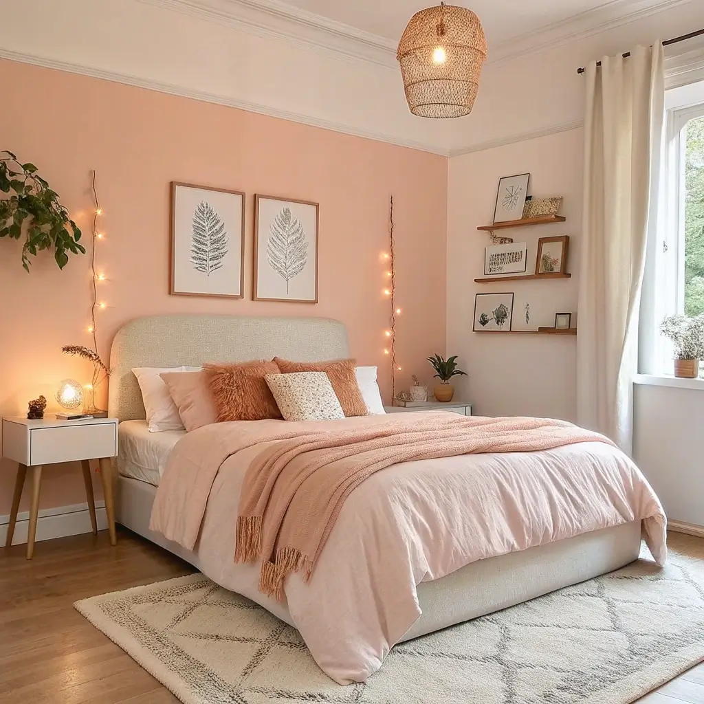 Sometimes you just want your bedroom to feel like a warm hug, right? The soft blush and apricot combination creates the coziest retreat imaginable.