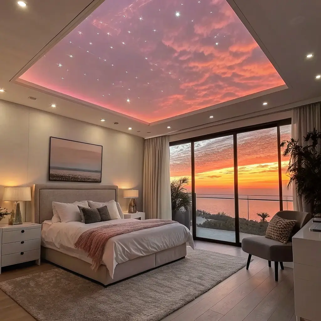 Look up! Your ceiling deserves love too, and a sunset gradient ceiling transforms your bedroom into an artistic masterpiece.