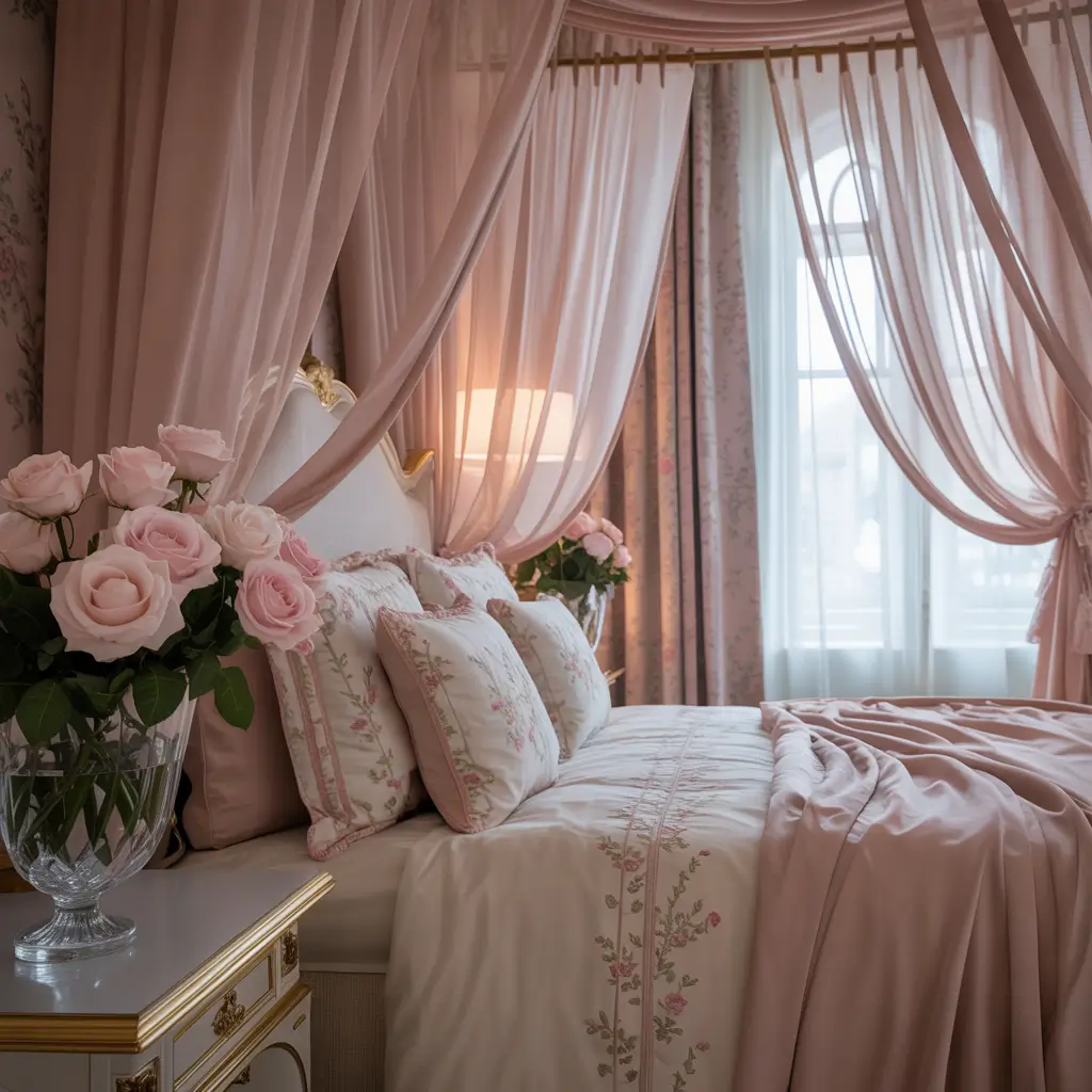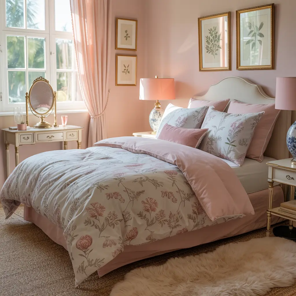 - Soft pink bedding with ruffles or lace details