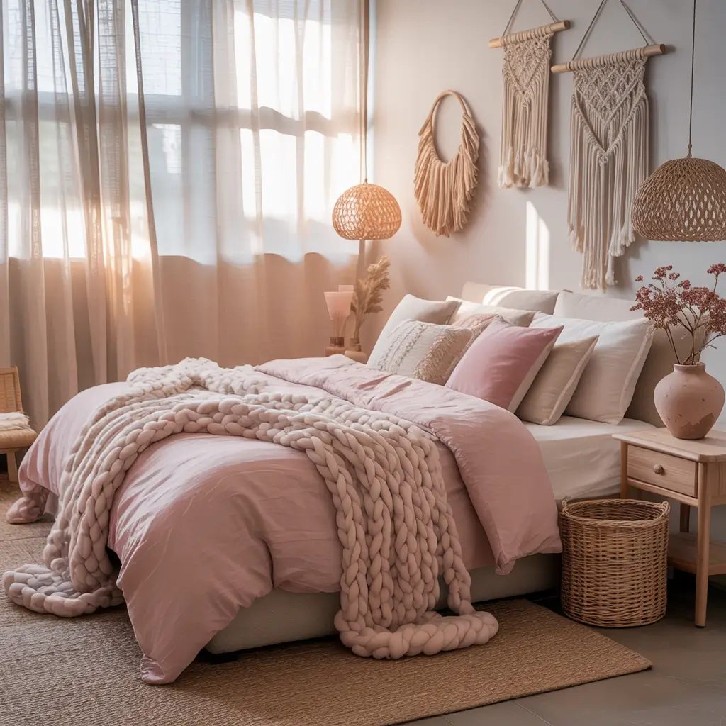 IMO, this style works best when you let it evolve organically. Start with a pink and white base, then add pieces you love over time. That’s the beauty of boho – nothing needs to match perfectly.