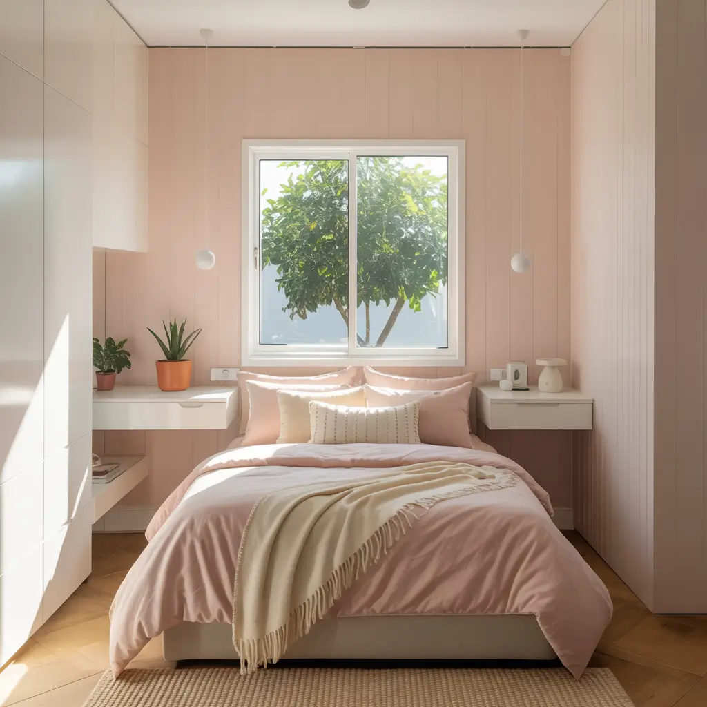 I transformed my tiny guest room using these principles, and now it feels twice as big. The soft pink walls bounce light around, while white furniture keeps things from feeling cramped.
