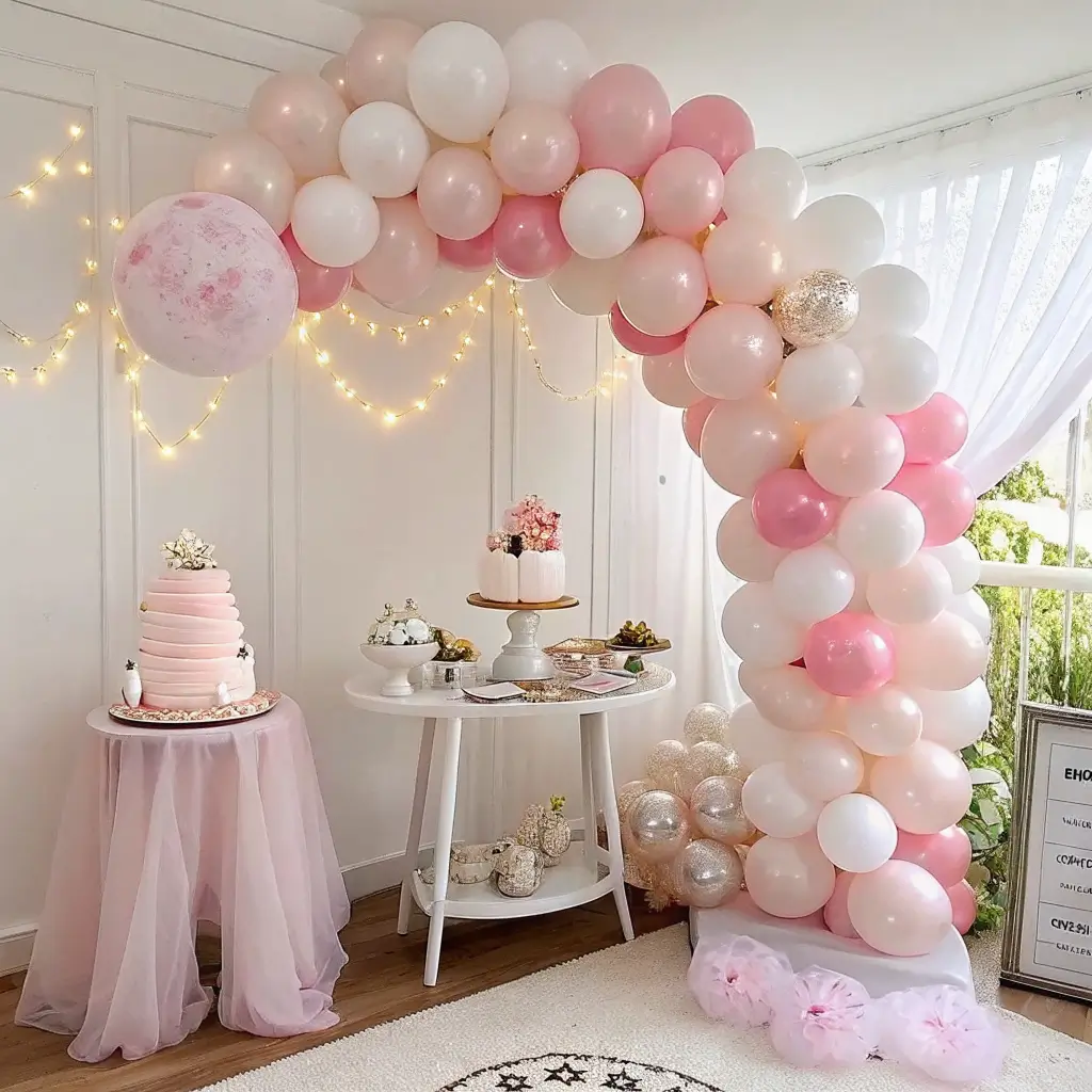 Let’s start with the showstopper that literally everyone will notice the second they walk in. A balloon garland is like the crown jewel of party decor, and when you nail the pink and white combo, it’s pure magic.