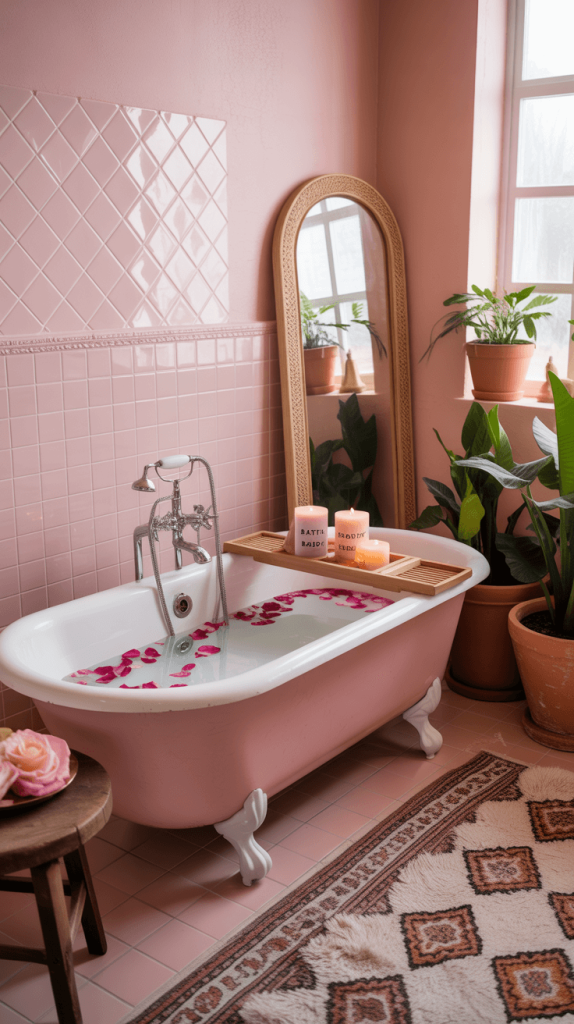 11. Pink Boho Bathroom Decor Ideas: Layered, Global, and Cozy