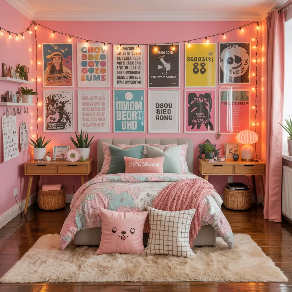 Wall decals, string lights, and photo walls are your best friends here. Create an Instagram-worthy corner with a pink fuzzy chair, some LED strip lights behind the headboard, and a gallery wall of their favorite memories. FYI, removable wallpaper in fun patterns makes this super easy to achieve without permanent commitment.