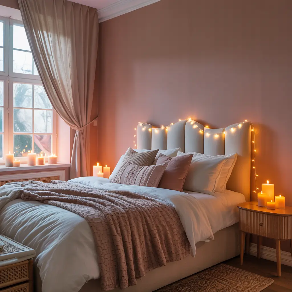 Lighting plays a huge role here. Swap out harsh overhead lights for table lamps with fabric shades, and add some candles (or LED candles if you’re paranoid like me). The soft, warm glow makes dusty pink walls look absolutely ethereal in the evening.