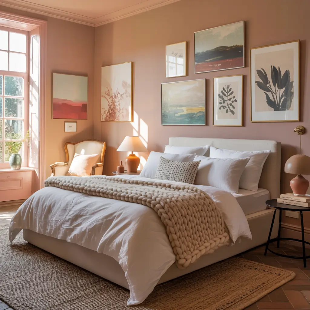 - Blush pink walls or large area rug