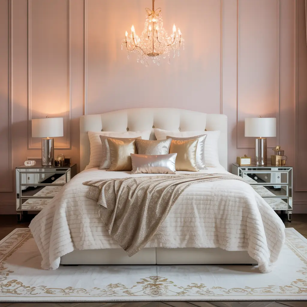 Mirrored furniture works incredibly well in this aesthetic. A mirrored nightstand or dresser reflects your pink elements and amplifies the glam factor. Add some sequined or metallic throw pillows, and you’ve got a space that literally sparkles.