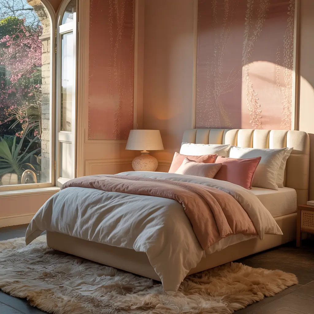 The hero piece should be a pink velvet headboard or ottoman. Don’t go crazy with velvet everything; one or two statement pieces create impact without entering grandma’s parlor territory. Balance velvet’s richness with crisp white sheets and maybe some marble or mirror accents.
