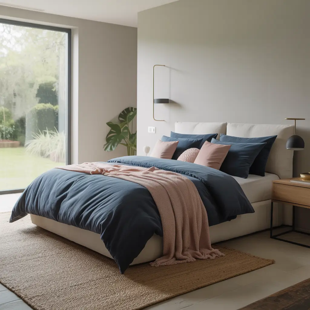 Plot twist: pink and navy might be the most underrated color combo in bedroom design. Navy grounds pink’s sweetness while pink softens navy’s seriousness. Together, they create this preppy-meets-modern vibe that works year-round.