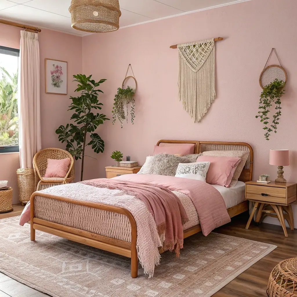 Don’t forget about smaller rattan accents too. A woven basket for blankets, a rattan mirror frame, or even a cute little side table can tie the whole look together. The key? Mix different shades of pink to avoid that matchy-matchy feel that boho style naturally rebels against.