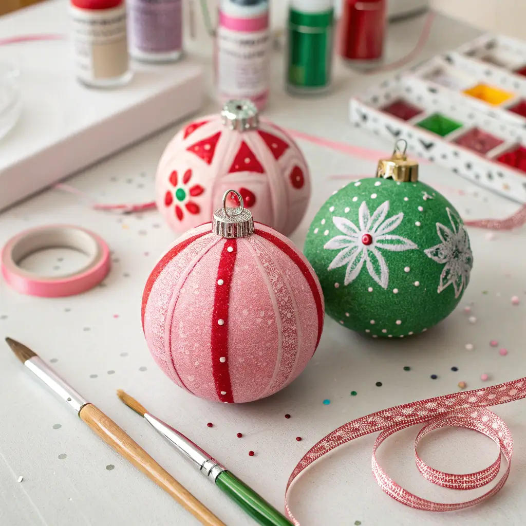 Those plain glass ornaments from the dollar store? They’re your new best friends. Here’s my favorite hack: remove the cap, add a few drops of pink acrylic paint, swirl it around, and boom – instant ombré ornaments. The paint creates this gorgeous marbled effect that looks way more expensive than it is.
