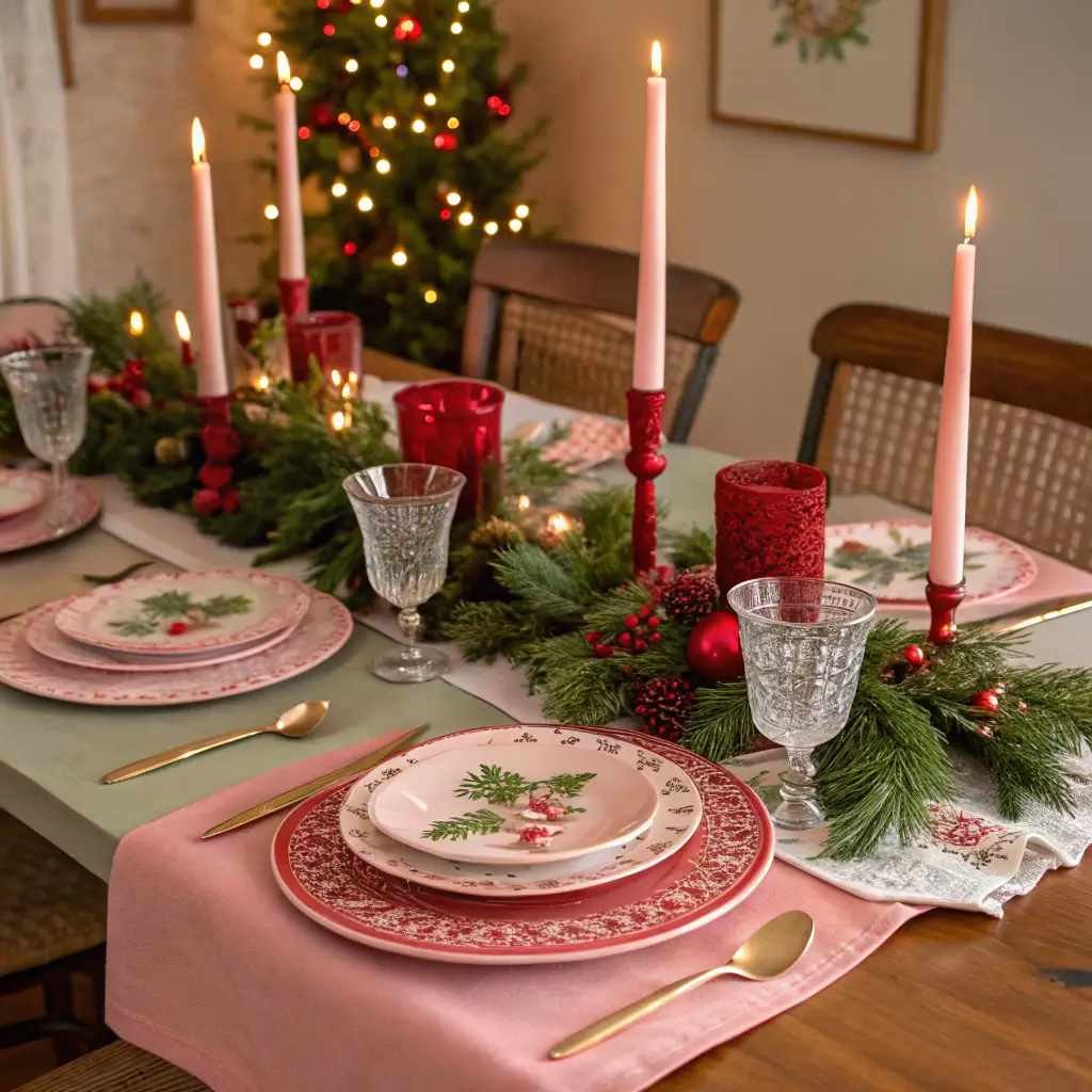 Holiday Table Setting in Pink, Red, and Green