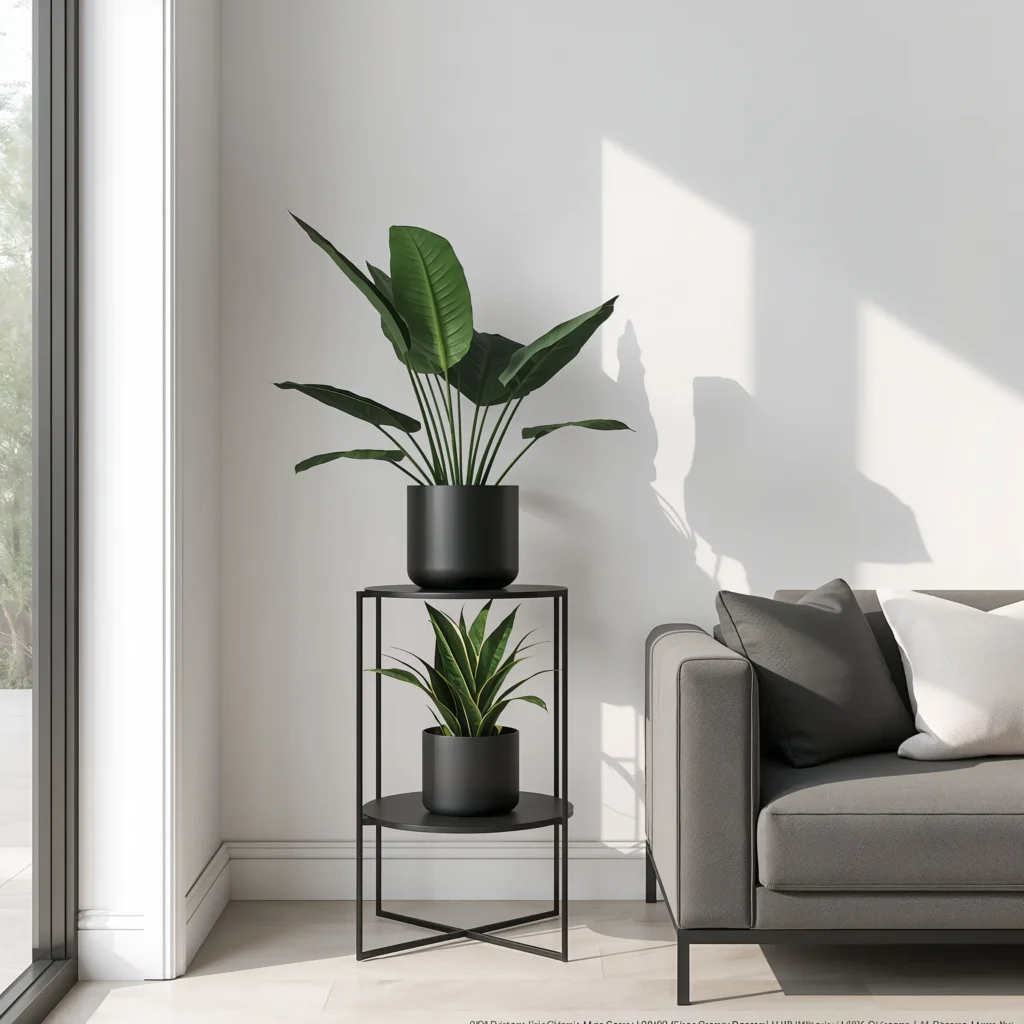 Black metal stands are my personal weakness. They’re sleek, they photograph beautifully, and they make any plant look more sophisticated. I’ve got this gorgeous three-tiered black metal stand in my living room corner that holds a fiddle leaf fig, a monstera, and a small succulent arrangement. The contrast between the dark metal and green foliage? Chef’s kiss