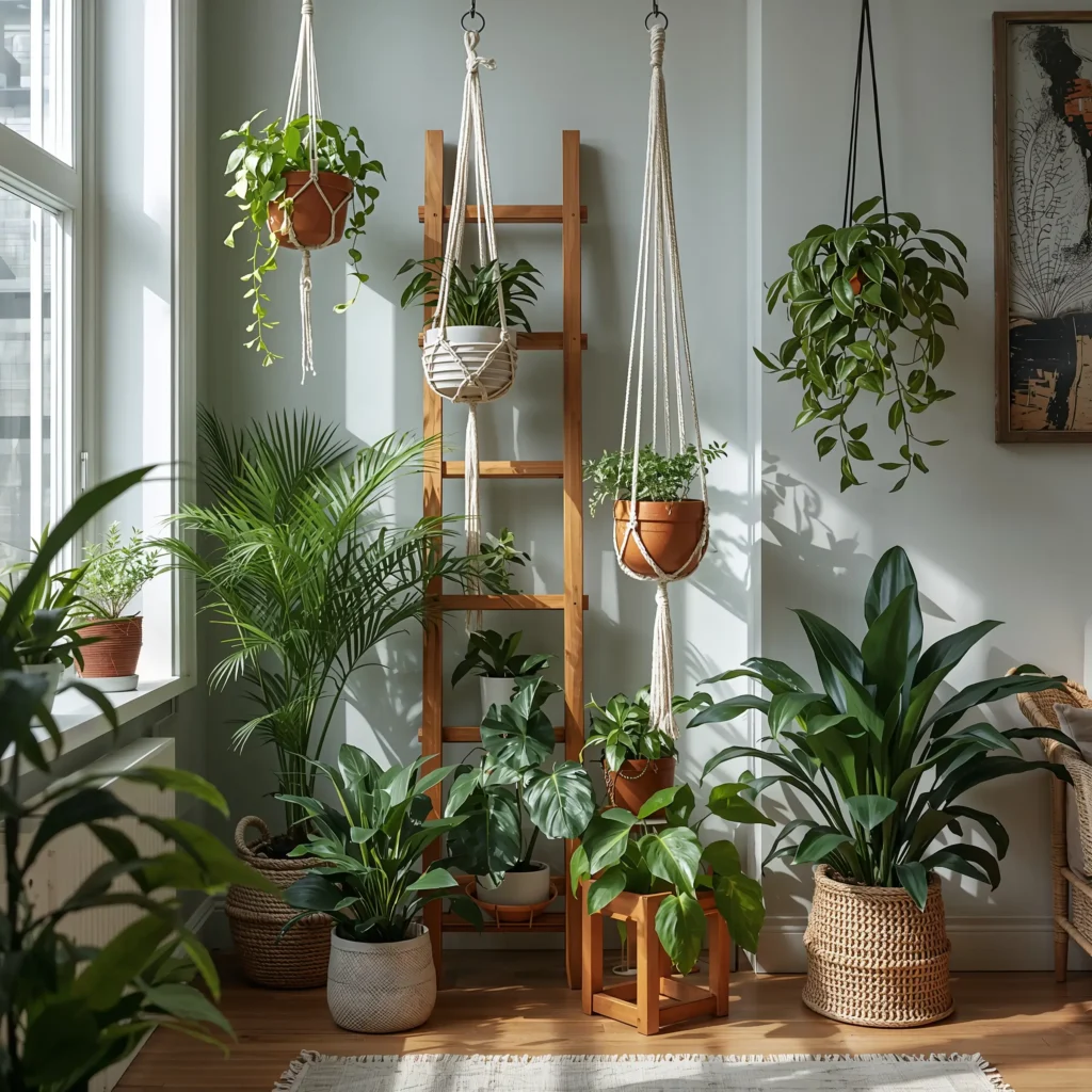 Layered plant stands are the secret sauce here. I’m talking different heights, mixed materials, and plants that cascade and climb in all directions. Think macrame hangers mixed with wooden plant stands, wicker baskets on the floor, and maybe a vintage ladder repurposed as a plant display.