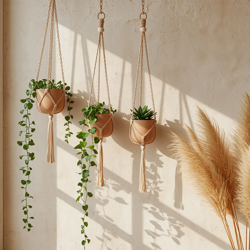 I’ve found that this style works particularly well with trailing plants. String of hearts, pothos varieties, and spider plants look absolutely stunning when they can drape naturally from their macrame cradles.