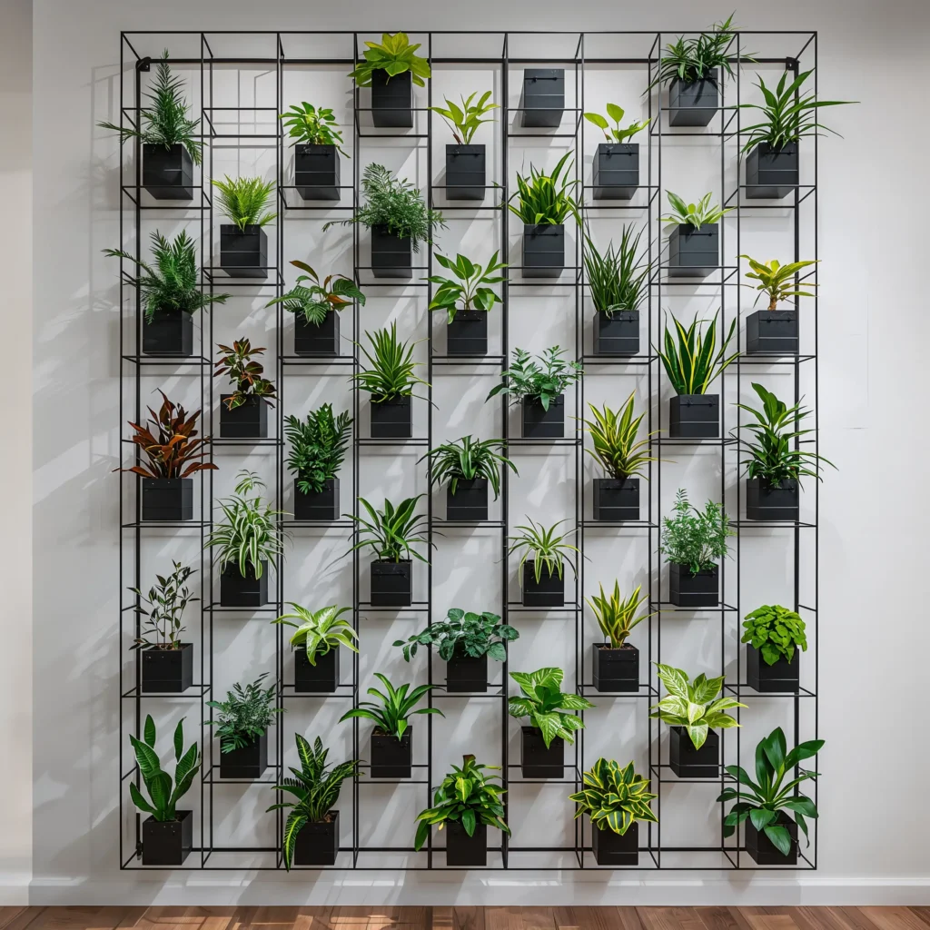 Modern metal frame plant walls bring an industrial edge that’s perfect for contemporary spaces. The clean lines and geometric shapes create a gallery-like presentation that elevates your plants from houseplants to art installations.
