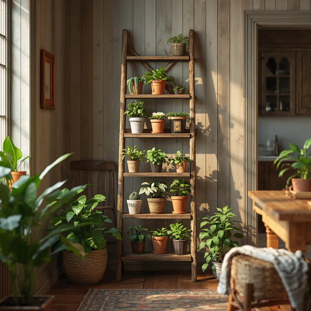 The beauty of the ladder approach is its flexibility. You can lean it against the wall for a casual look, or mount it securely for a more permanent installation. Each rung becomes a shelf, and you can adjust plant placement as your collection grows or changes.