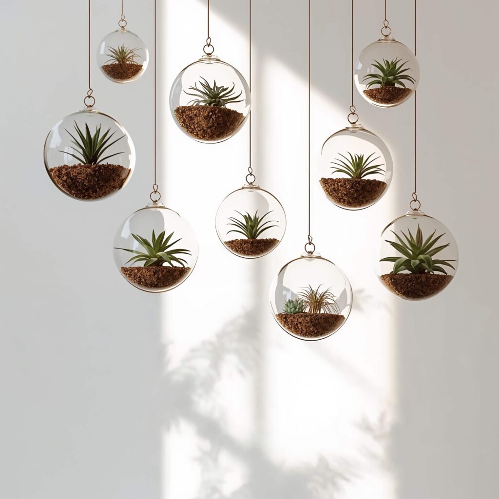 Hanging glass terrarium walls bring a touch of scientific elegance that’s absolutely mesmerizing. There’s something almost magical about seeing plants suspended in glass orbs, creating these perfect little ecosystems floating on your wall.