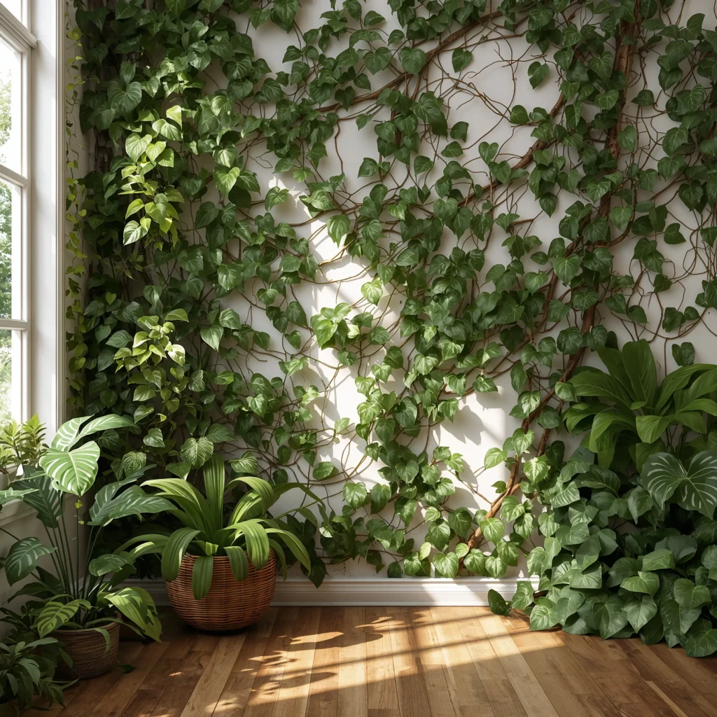 Corners are often the forgotten spaces in room design, but a corner green climbing vine wall transforms these awkward areas into stunning focal points. This approach works with your room’s architecture rather than fighting against it.