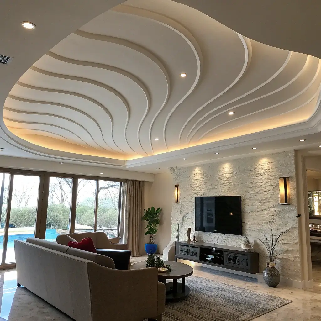 These designs feature smooth, undulating surfaces that flow across the ceiling like frozen waves. The curves can be subtle โ just a gentle arch here and there โ or dramatic, with deep swoops that transform the entire ceiling into a sculptural masterpiece. What I love most is how they soften harsh room angles and create a sense of movement that static, flat ceilings can’t match.