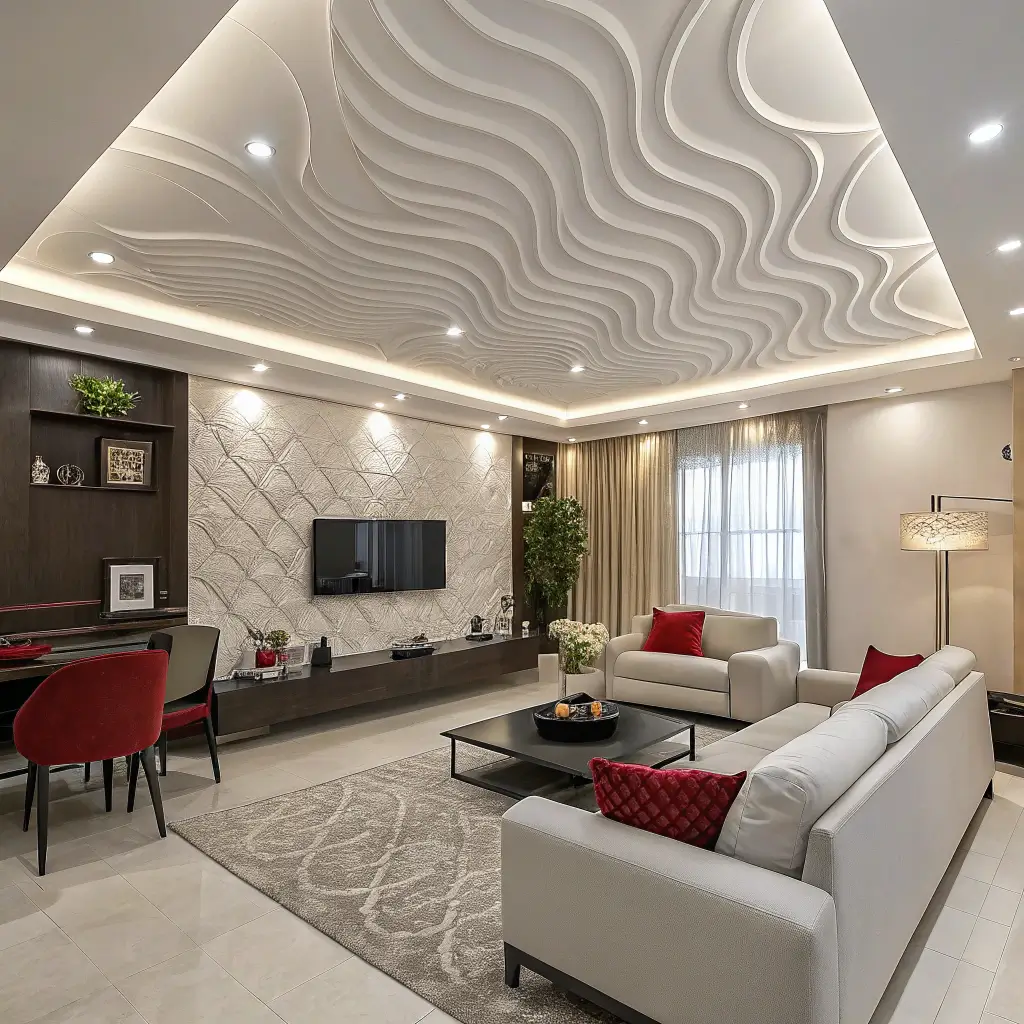 Ready for something truly spectacular? 3D wave designs turn ceilings into sculptural art pieces that create movement and flow in static spaces. These organic shapes bring a sense of fluidity that softens harsh architectural lines.