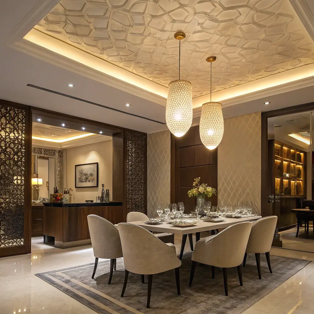 The trick is planning pendant placement during the POP ceiling design phase. You want to create recessed areas or ceiling roses where pendants will hang, ensuring clean wire management and professional-looking installation.