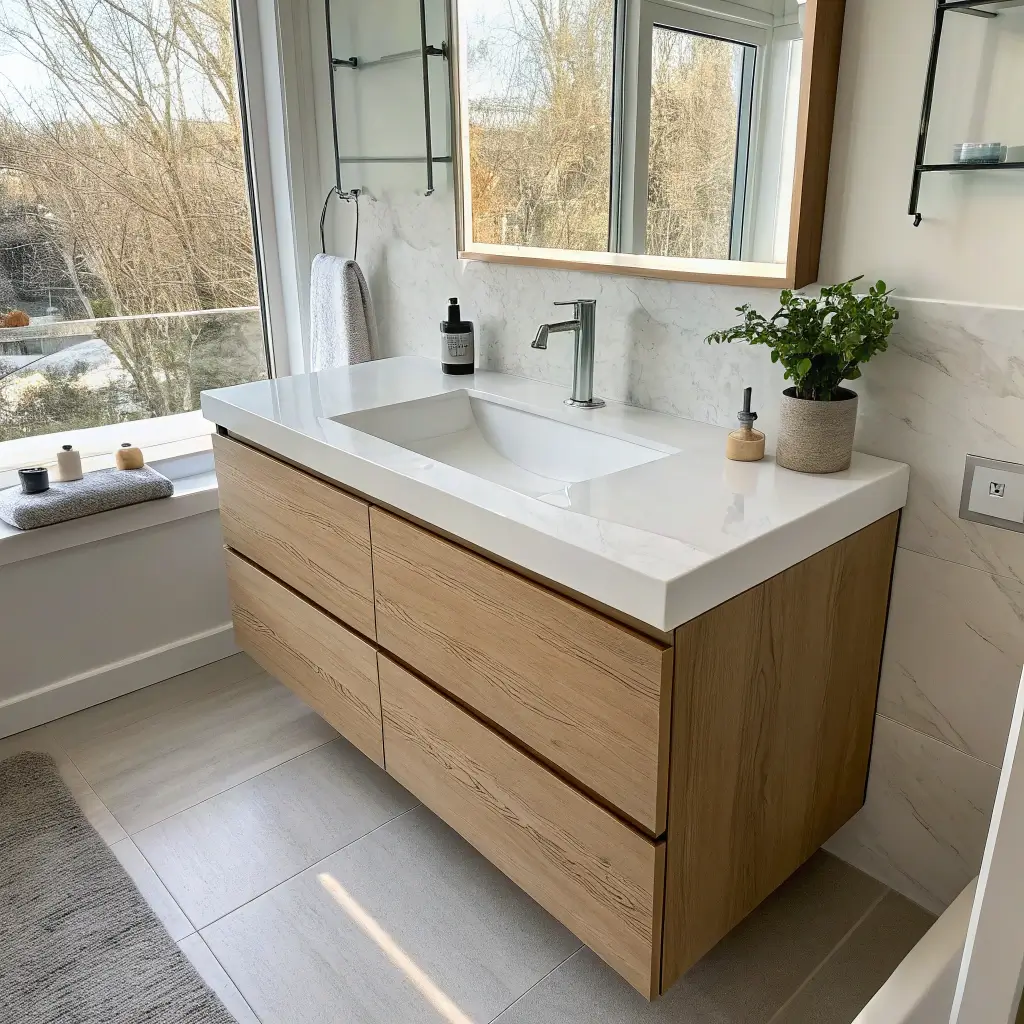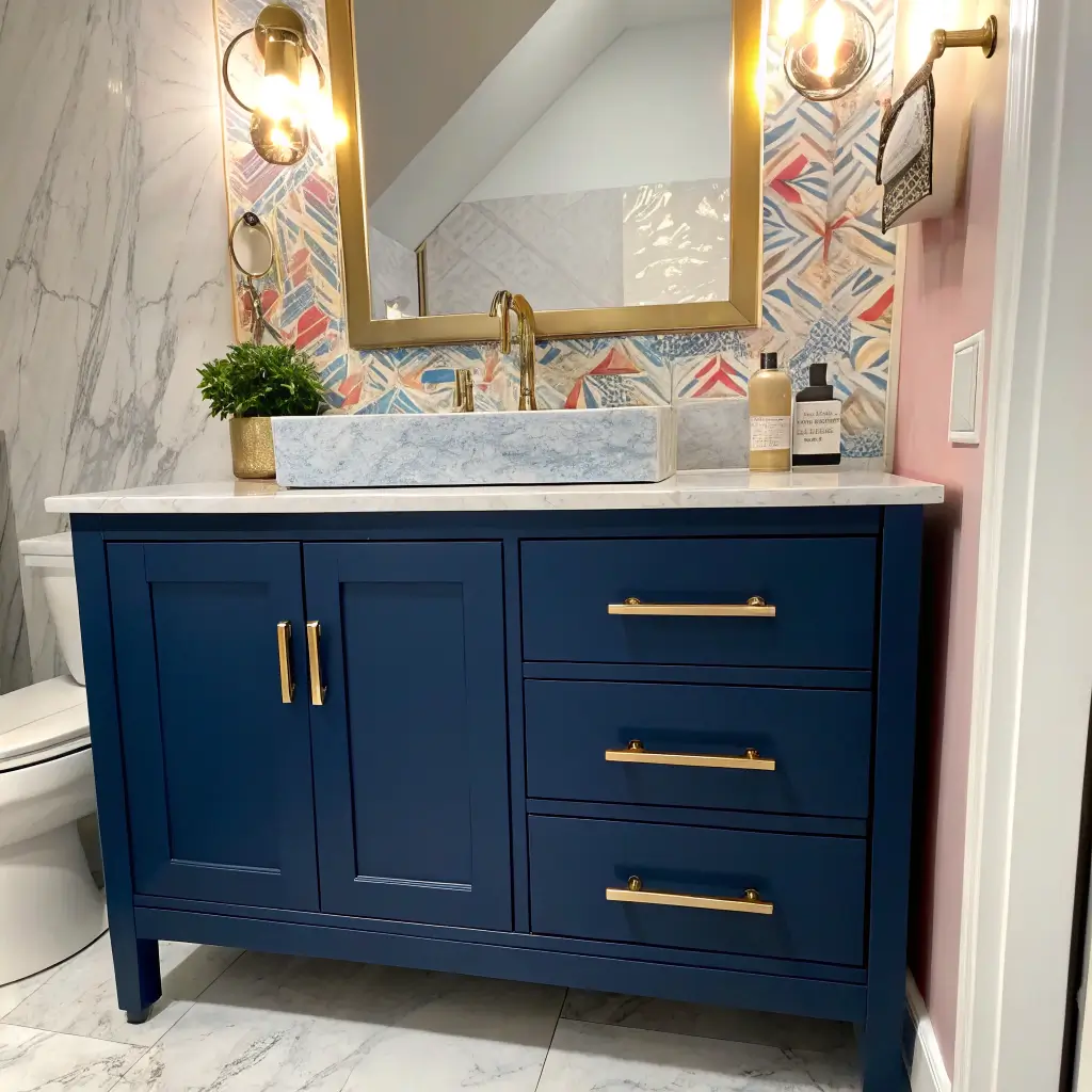 Can’t decide between two colors? Why choose? Two-tone vanities let you have your cake and eat it too. Think navy base with white countertop, or wood drawers with painted frame. This trend adds visual interest without overwhelming small spaces.