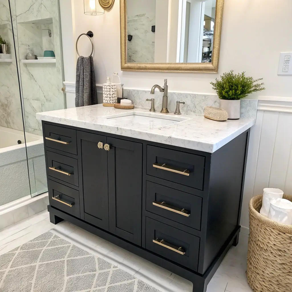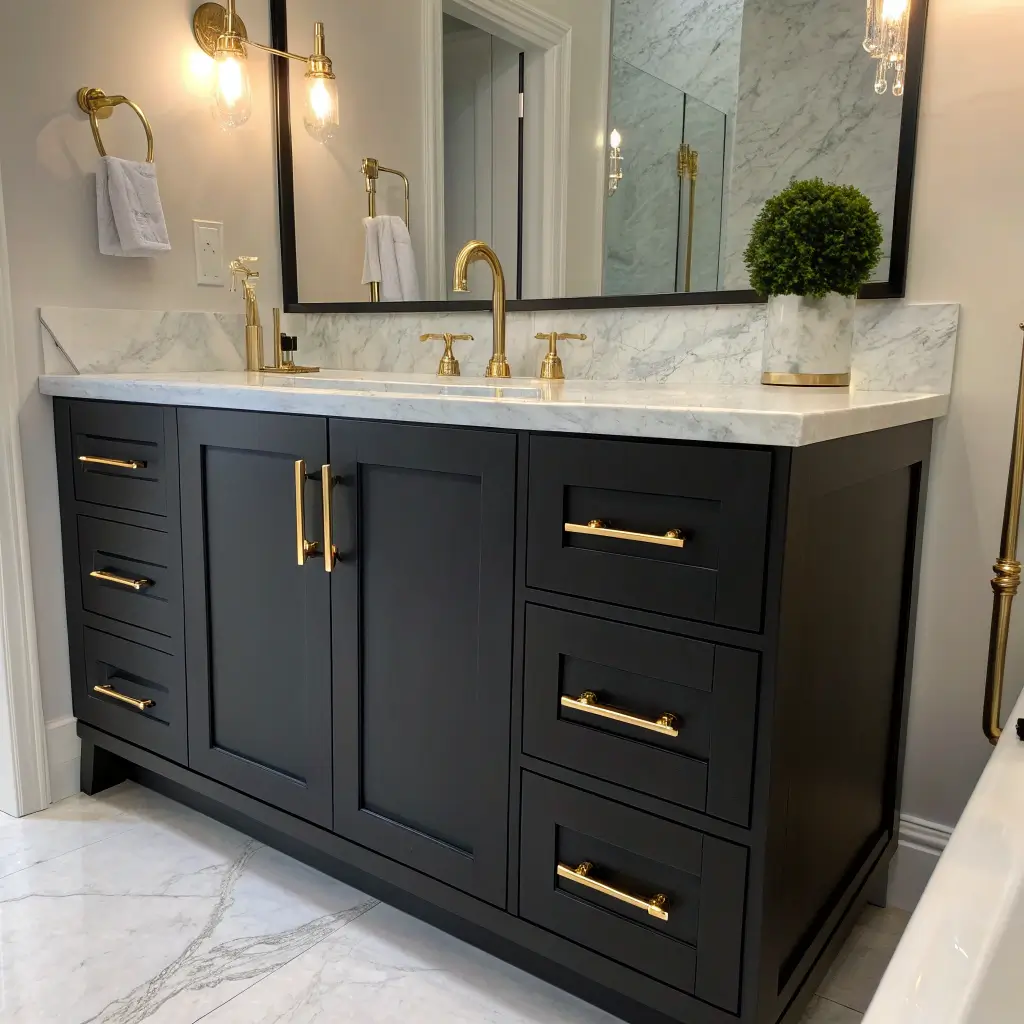 Ready to make a statement? Black matte vanities with gold hardware are having a serious moment, and I’m here for it. This combo brings instant drama without being overwhelming – it’s sophisticated rebellion at its finest.