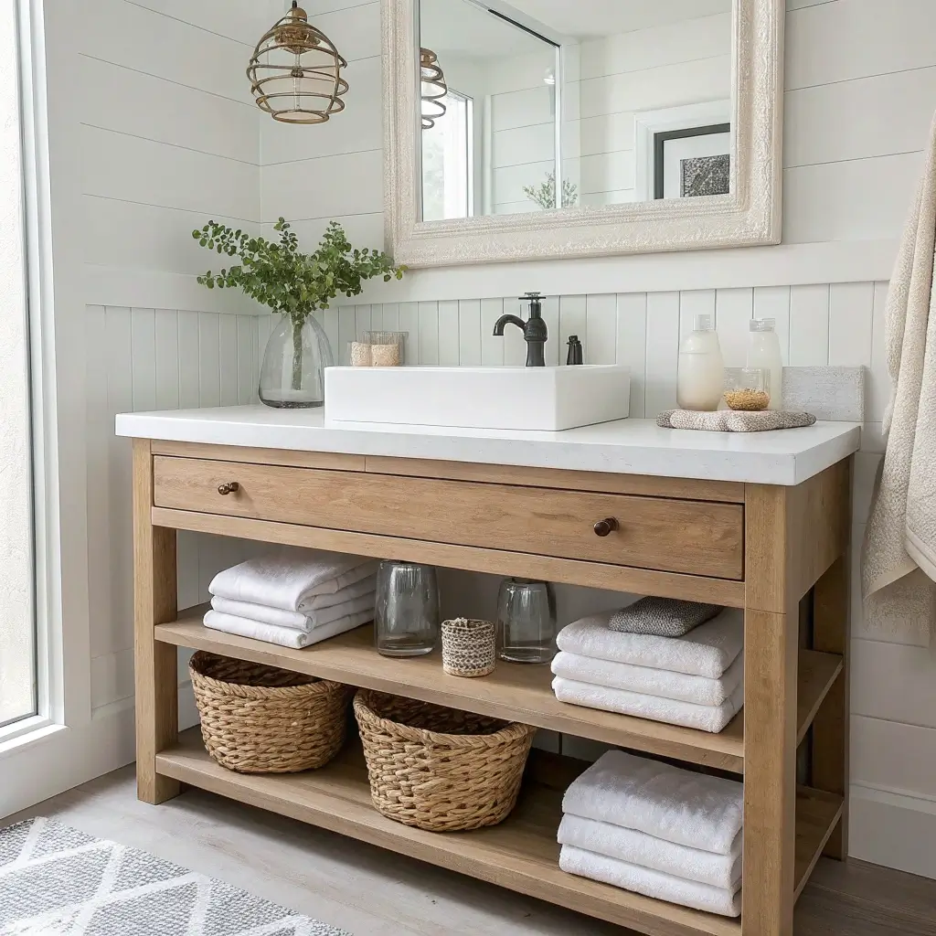 Consider your realistic needs too. Love the look of open shelving but know you’ll never keep it styled? Skip it. Obsessed with marble but have hard water that’ll stain it immediately? Look into alternatives. The best vanity is one that works for your actual life, not your Pinterest board life.