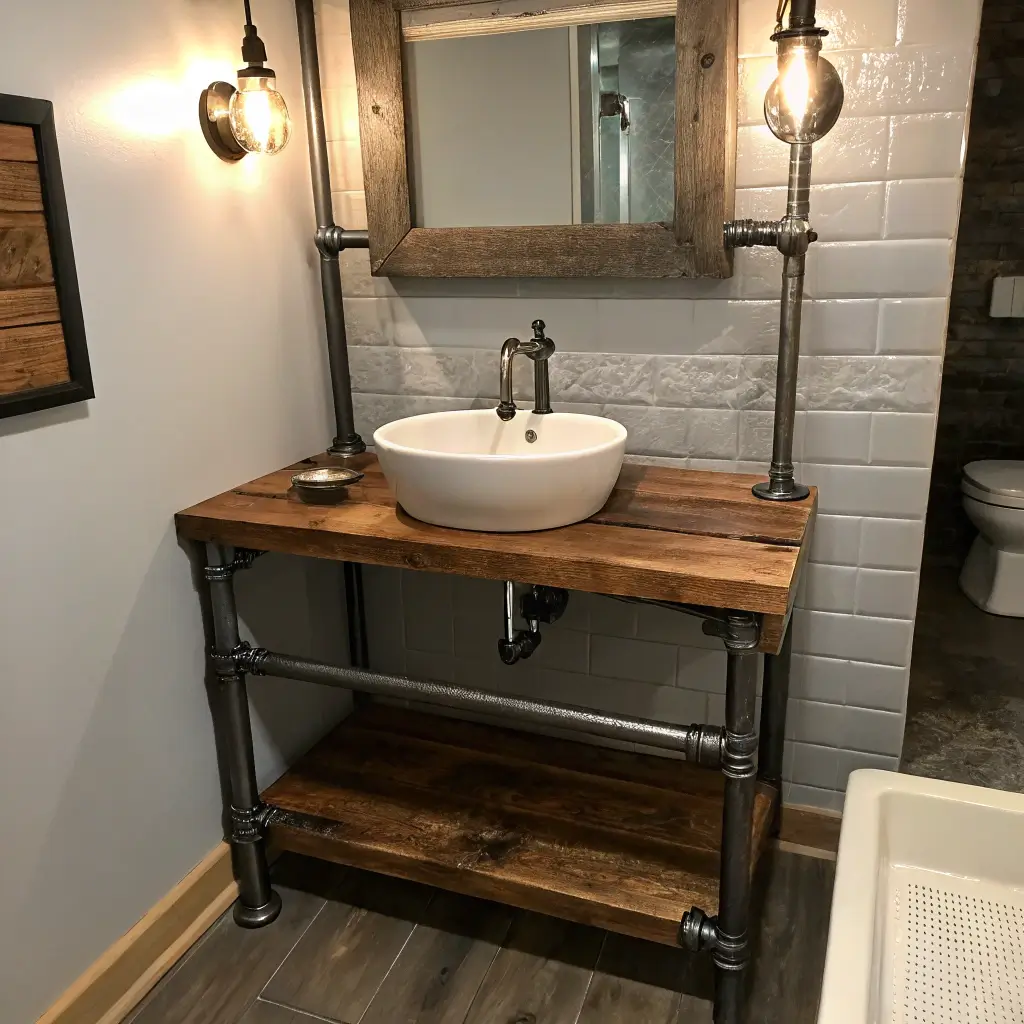 Industrial pipe vanities bring raw, urban edge to powder rooms. Picture black iron pipes forming the frame, maybe a reclaimed wood top, and definitely some Edison bulb action happening above. It’s the perfect style for lofts, modern homes, or anyone who loves that urban warehouse vibe.