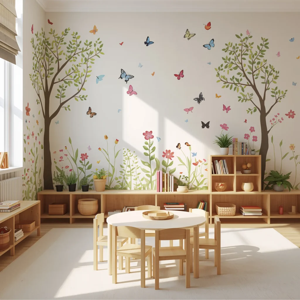 Bringing the outdoors inside works wonders for preschoolers, especially those in urban settings who might not get much nature time. A nature-inspired wall mural creates a calming atmosphere while providing endless learning opportunities.