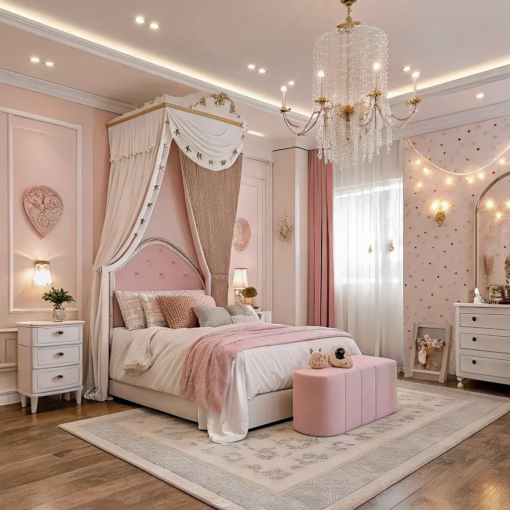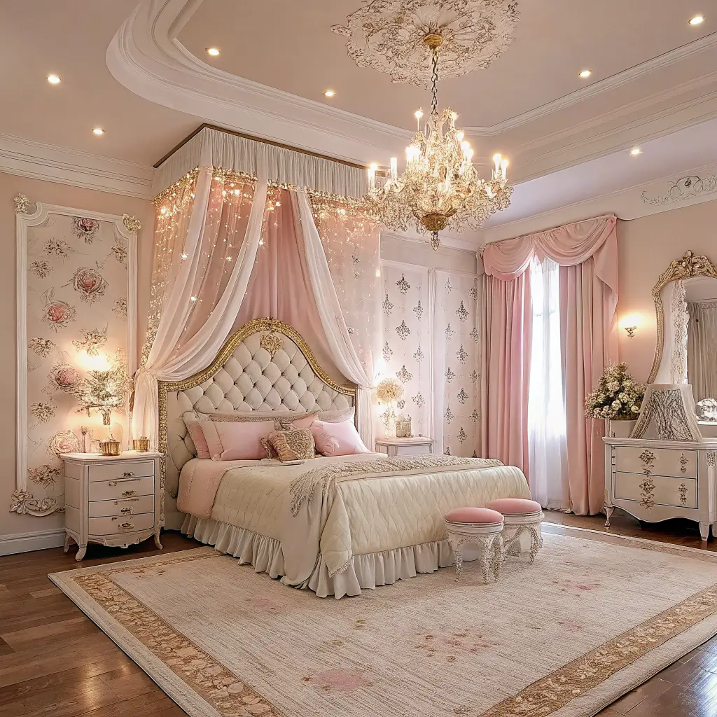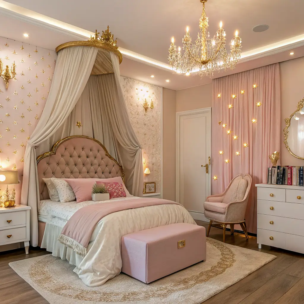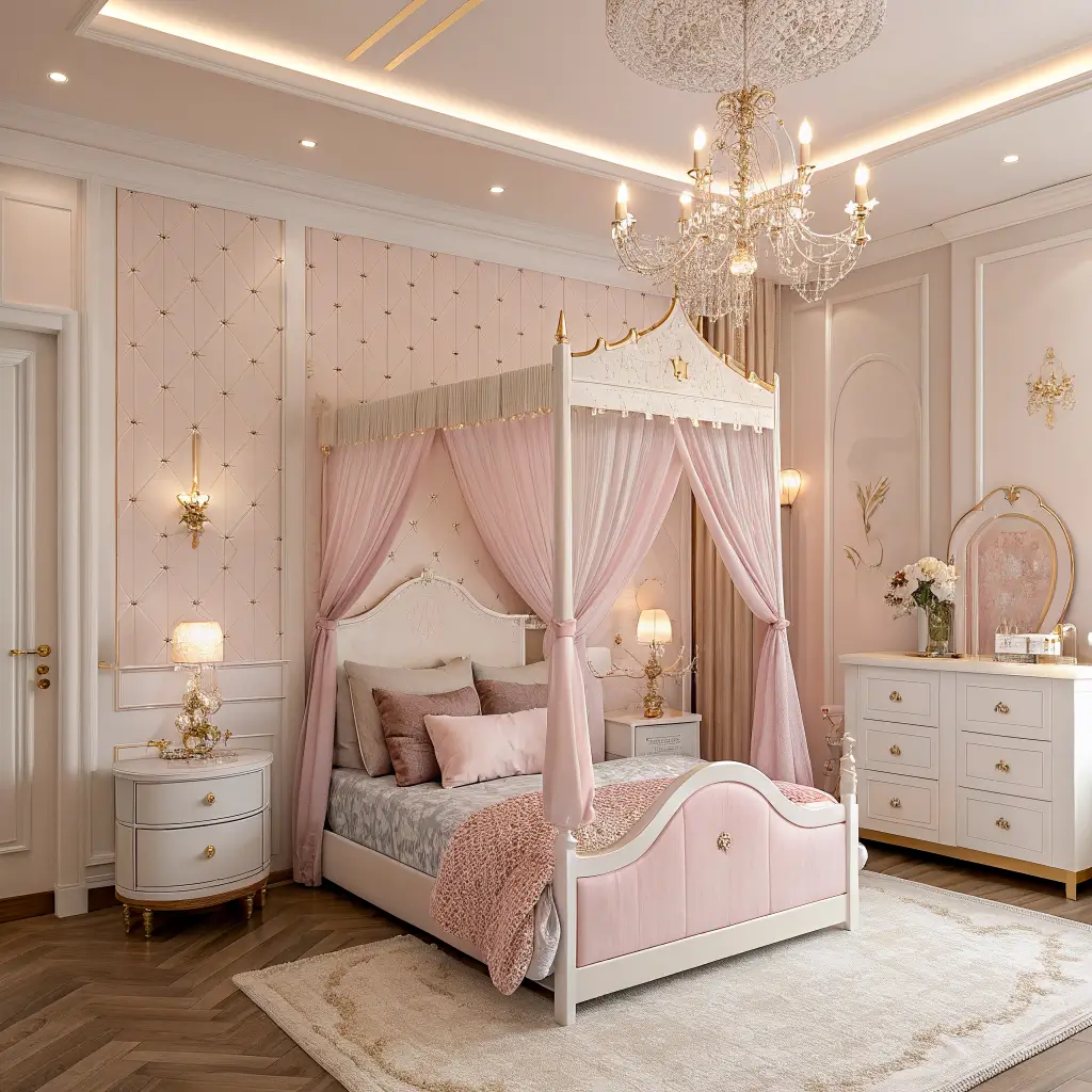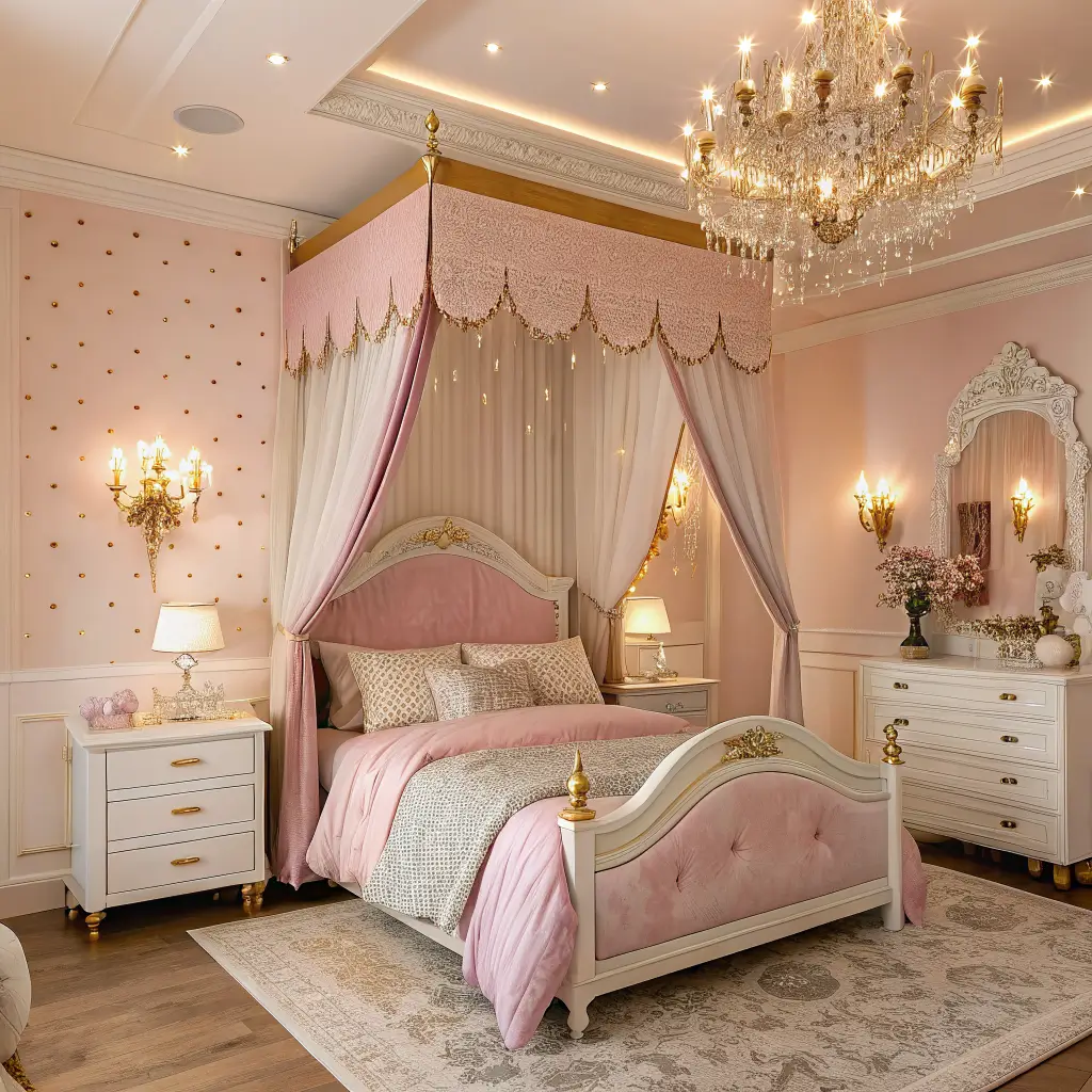 Sometimes you just want to go all out, right? The luxury princess bedroom pulls inspiration from real palaces and five-star hotels. We’re talking custom everything and materials that feel expensive because they are.