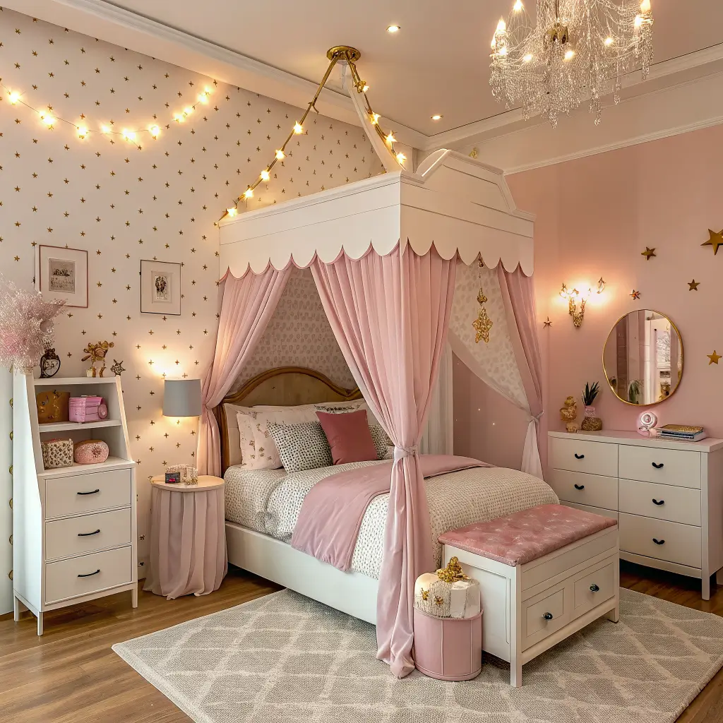 Replace cartoon princesses with fashion illustrations or vintage Hollywood glamour photos. Swap plastic tiaras for metallic geometric decor. Instead of pink everything, try a black and gold palette with blush accents. These rooms feel aspirational rather than juvenile.