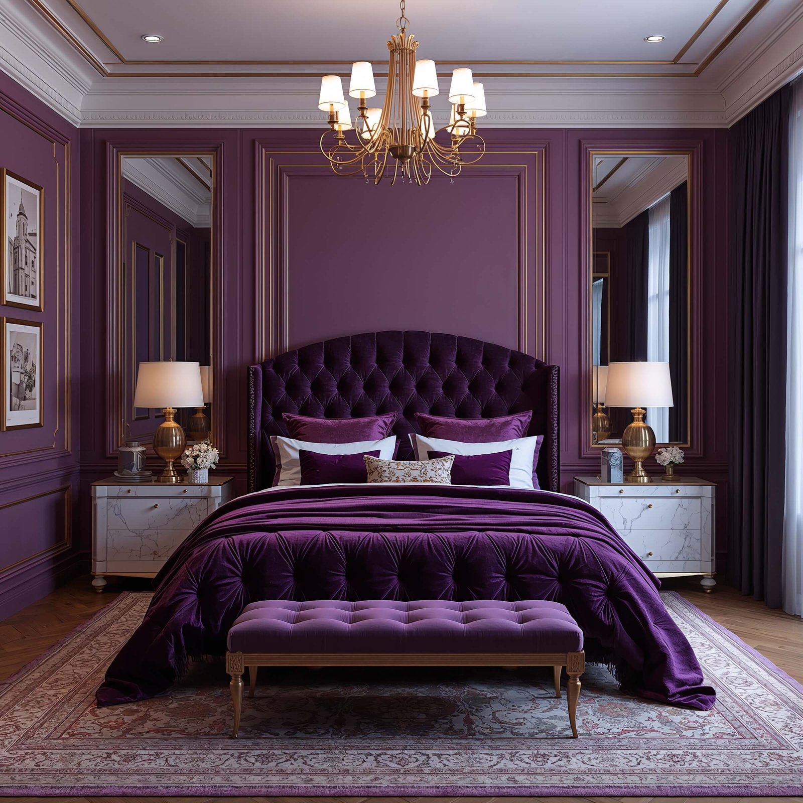 Start with a statement purple wall – think deep plum or royal purple with subtle shimmer. Add a tufted velvet headboard in purple (go big or go home), mirrored furniture, and crystal everything. Your lighting should sparkle – chandeliers, crystal table lamps, LED strips behind your headboard for that Hollywood glow.
