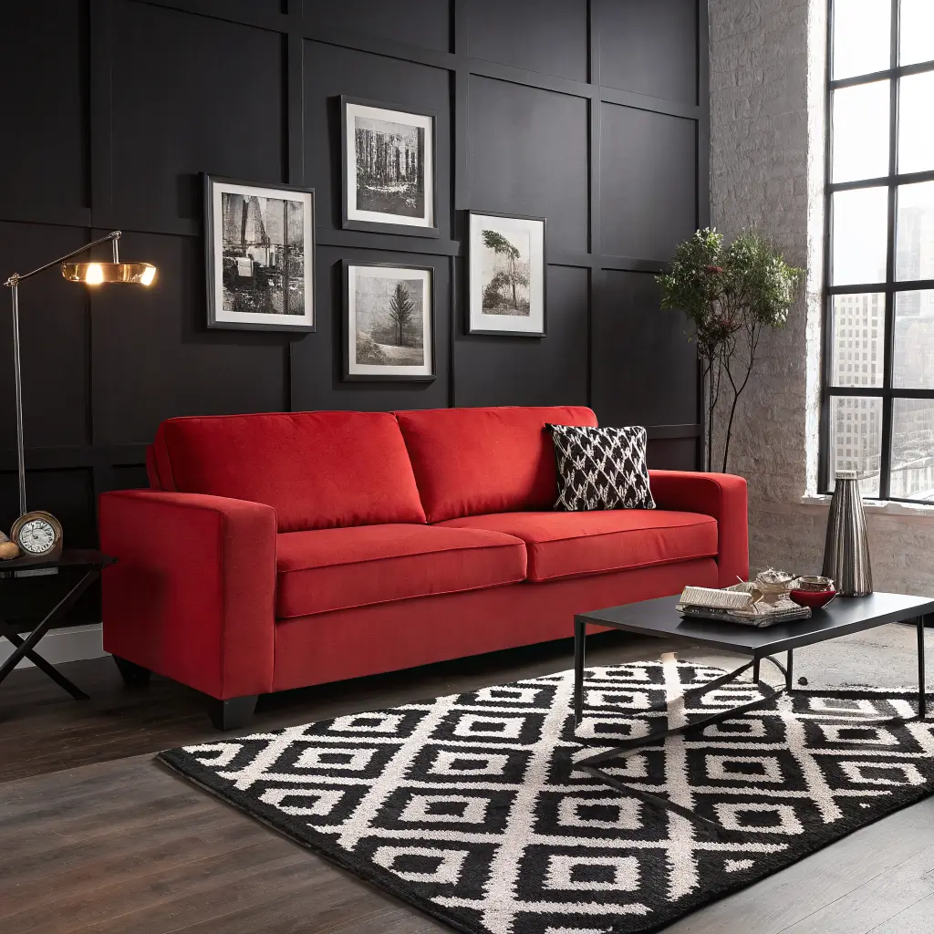 Want to add interest without cluttering? Geometric patterns are your secret weapon. A black and white geometric rug under your red couch creates visual intrigue without adding more colors to worry about. Plus, it hides coffee stains pretty well (speaking from experience here).