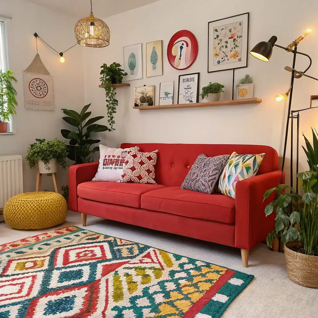 Vibrant Red Couch with Colorful Rugs
