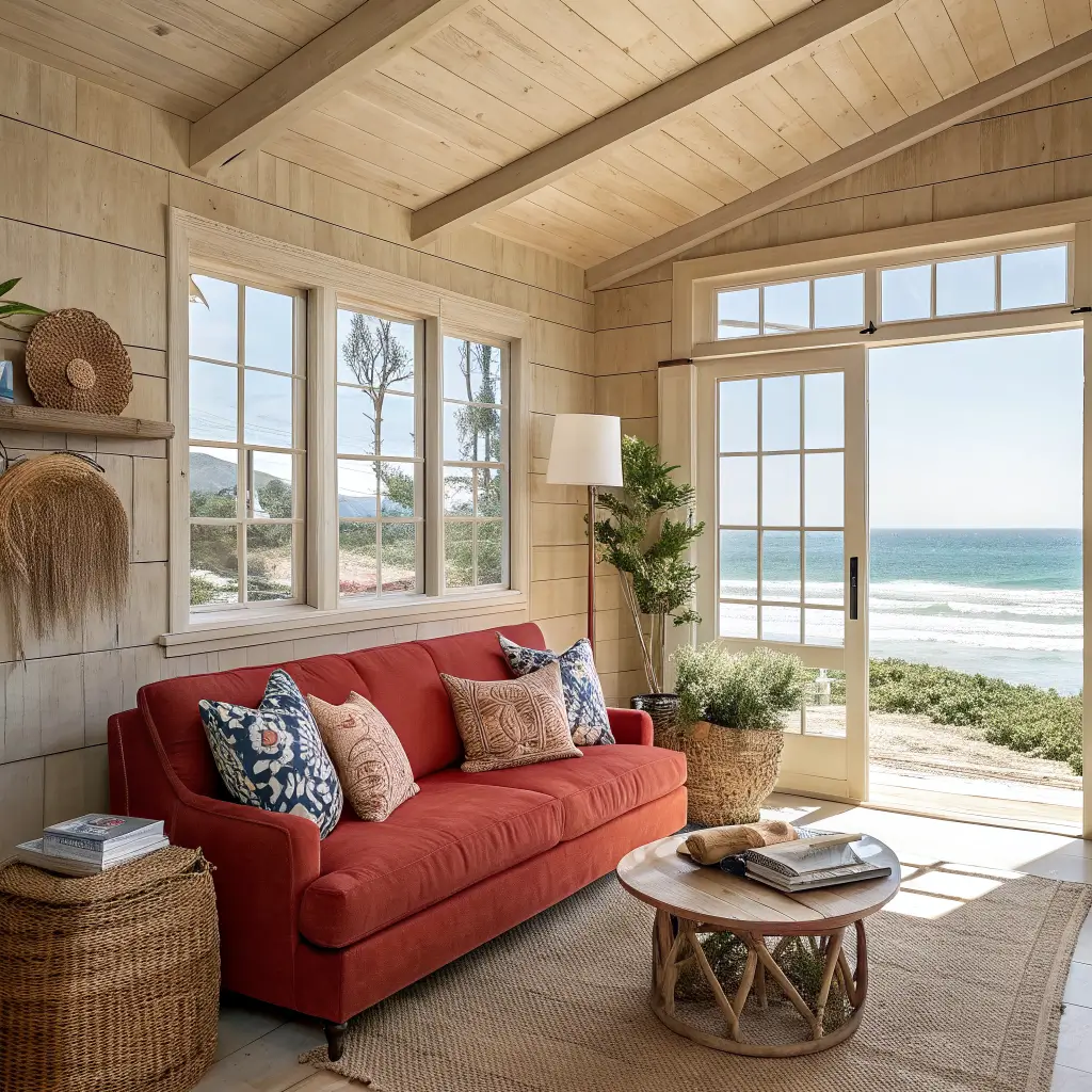 Wait, red in a coastal room? Hear me out. Think nautical red, not fire-engine red. Navy and white stripes, weathered wood, rope details, and yes, your red couch channeling those classic beach house vibes.